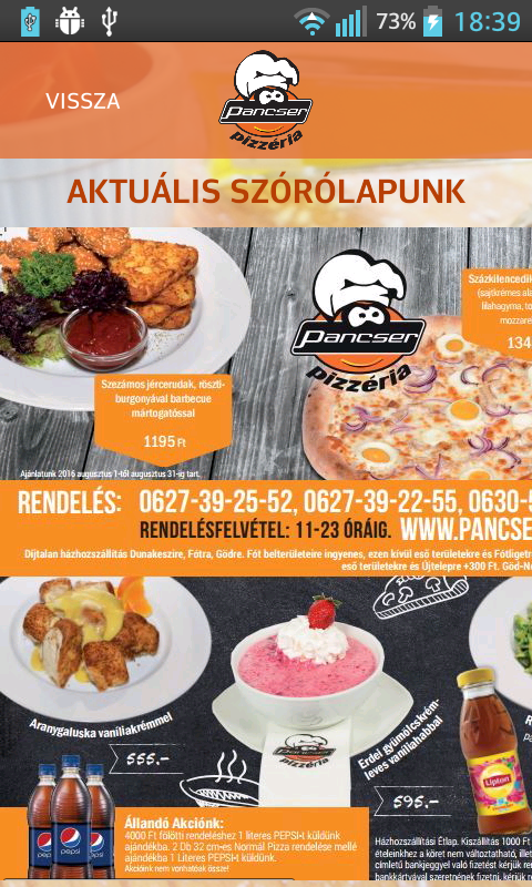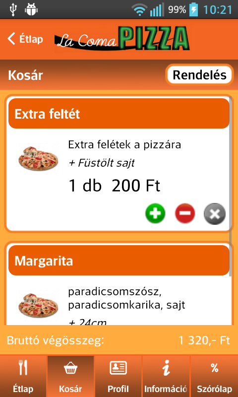 Éttermi alkalmazásA donpapa.hu honlappal megegyező, teljes értékű működés: regisztráció, bejelentkezés, adatmódosítás lehetősége. Új verzió keresése indításkor. Indításkor étlap szinkronizáció a honlappal. Profil adatok szinkronizálása a honlappal. Több szállítási cím kezelése. Tálcára helyezett ételek mentése. Kedvencként megjelölhető ételek, melyeket külön menüpontból is el lehet érni. Pizza méret és feltét választás, főételekhez köret választás. Nyitvatartási idő figyelése, ételrendelés csak nyitvatartási időben lehetséges. Rendelések érkeztetése a honlap adminisztrációs felületére. Étel rendelő alkalmazás, mely a donpapa.hu honlapunk mintájára készült. Használata teljes értékű: Regisztráció, bejelentkezés, adatmódosítás, ételek kiválasztása és rendelése egyszerűen a zsebedből! Jó étvágyat!Letöltés: Don Papa Étterem - Google Play Áruház Don Papa Étterem - App Store << Vissza a lap tetejére